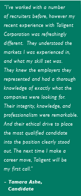 Many of our recruiters come from the very industries they serve. At Taligent Corporation, we speak your language, and can open doors, because we know who the players are, what’s hot and what’s not, in hundreds of career fields. Think of us as your personal industry consultants. Each of our Account Executives is a search team leader supported by a group of Project Managers, Project Coordinators, and Research Assistants. We carefully match a candidate’s skills and experience with an employer’s requirements to enhance job satisfaction and improve longevity. We represent quality career opportunities throughout the United States. However, we do not attempt to list our search assignments on our website. We encourage qualified candidates to contact a recruiter at Taligent Corporation to discuss our current openings. We believe that building a strong, on-going relationship with one of our recruiters is the best strategy for finding exceptional career opportunities. Remember, the worst time to start a job search is when you are between positions. The top talent, the candidates who always seem to land the best jobs, never stop networking. They continually keep their finger on the pulse of the market, and never close themselves off to hearing about new opportunities. If you have relevant experience in any of the above fields, we encourage you to send us your resume today. We will only contact you in the event any exciting new positions open up that match your background and skill set. Then you can decide for yourself if the timing is right to consider taking a closer look or making a move. To send us your resume, click here: Submit Resume