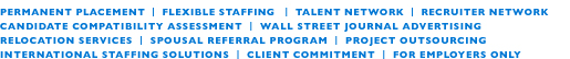In today’s job market, astute employers need a staffing partner with the wide reach of Taligent Corporation’s vast professional network. You won’t find more highly trained professional recruiters anywhere. Hundreds of companies choose us to find the top talent in their industry. Our clients trust us to deliver the very best in search and placement. At Taligent, we have one true passion…to match up the right people with the right jobs. Because the business climate has changed so dramatically, employers are now concentrating more on their core competencies and outsourcing non-core functions, such as staffing, to strategic partners. In our target markets, no company is better positioned to serve as your staffing partner than Taligent Corporation As part of our complete solution for employers, we offer the following services: Permanent Placement - Our team of specialized Account Executives will quickly find the top candidates for any position in your organization. We work on retainer, engagement, or contingency agreements. Contact our office today to discuss which type of agreement best meets your needs. Back to Top Flexible Staffing - Interim staffing is a strategic tool used by many of our clients to address their short-term personnel needs. We recruit flexible talent for immediate placement without a long-term commitment on your behalf. Back to Top Talent Network - We pursue every possible source of candidates to identify and evaluate the best talent to satisfy our clients’ needs. After years of recruiting and networking, we have built a database of over 125,000 known candidates in our specialized industries. The vast majority of the candidates we present to our clients always come from our existing direct recruit network. However, we also know that the market for talent is extremely dynamic and changes constantly. People gain new experience. People change careers. People retire. If we aren’t constantly developing new relationships and bringing new life to our database, it quickly becomes useless. We’re in the market for talent. And we believe that our greatest asset is the depth and breadth of our network. In some instances, we need look no further than our own pool of identified talent. In other cases, we dedicate a team of project recruiters to aggressively go out and find the right candidates for the job. Regardless, our only goal is to find the right fit, the best possible fit, for our clients. Our added value to you is our ability to apply extensive dedicated resources and focus to your specific critical staffing needs. Back to Top Recruiter Network - Our office is part of an international search and recruitment network. With hundreds of recruiters worldwide, we can leverage a much larger team of industry specific experts to assist you in solving your staffing challenges. When you engage Taligent Corporation, you now have access to thousands of the best candidates in the world. Back to Top Candidate Compatibility Assessment - Hiring mistakes can be costly, both in time and money. SelecSys is a quick, reliable assessment tool we use to verify that a candidate is the right fit for your company. Offered on all exclusive search assignments, it provides a customized profile of the ideal characteristics needed for a position, a charted assessment of a candidate’s personality traits, and an indication of how the candidate fits the position. SelecSys also offers behavior-based interview questions and a post-hire feedback system to ensure that the new hire is functioning effectively in their new work environment. Back to Top Wall Street Journal Advertising - As part of our proactive client services, we have negotiated special volume pricing with the Wall Street Journal. Depending on the extent of your search assignment, you may be eligible for this program. These deep discounts have saved employers tens of thousands of dollars in classified advertising expenses, and can really help jump-start a stalled search. Back to Top Relocation Services - We offer a complete array of relocation services to our clients, with comprehensive information and support for all your relocation needs. Some of the services provided include a detailed cost of living analysis of over 700 cities, real estate agency referral services, special mortgage referral services, and substantially reduced moving rates. We can make the relocation process easier, saving time and money for both candidate and employer. Back to Top Spousal Referral Program - Often, if relocation is involved, the only thing standing between you and your favorite candidate is a spouse or significant other. If the spouse is also employed in one of our target markets, we will assign one of our search teams to the placement project. If the individual’s talents are outside these fields, we will refer them to another office within our search and recruitment network which specializes in placing candidates with their skills and background. Back to Top Project Outsourcing - Employers who need to fill a large number of positions with similar candidate profiles can outsource their staffing projects through our Major Projects program. We create project teams from our network of offices to successfully fulfill large staffing assignments, quickly and efficiently. Whether it’s 50 sales representatives to open a regional market, or 500 service representatives to introduce a new product nationwide, we’re up to the task. By outsourcing major staffing assignments to us, you are able to concentrate on your core competencies, while the best recruiting professionals in the world deliver the staffing results you want. Back to Top International Staffing Solutions – In today’s global job market, there are no borders. We provide worldwide staffing services to our clients through our international network. Our international specialists offer a full range of staffing and consulting services, as well as sound advice on international candidates and cultu
